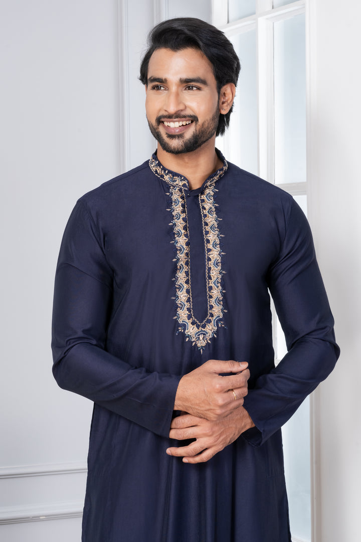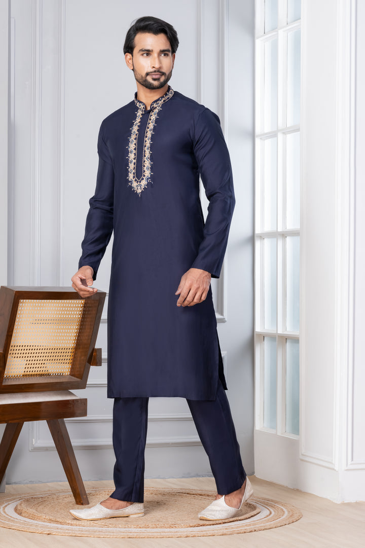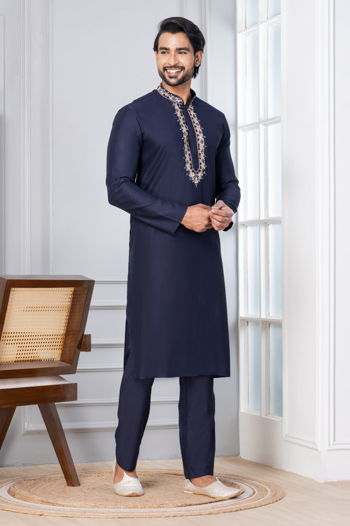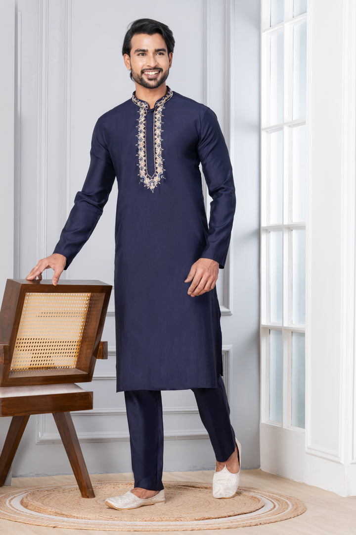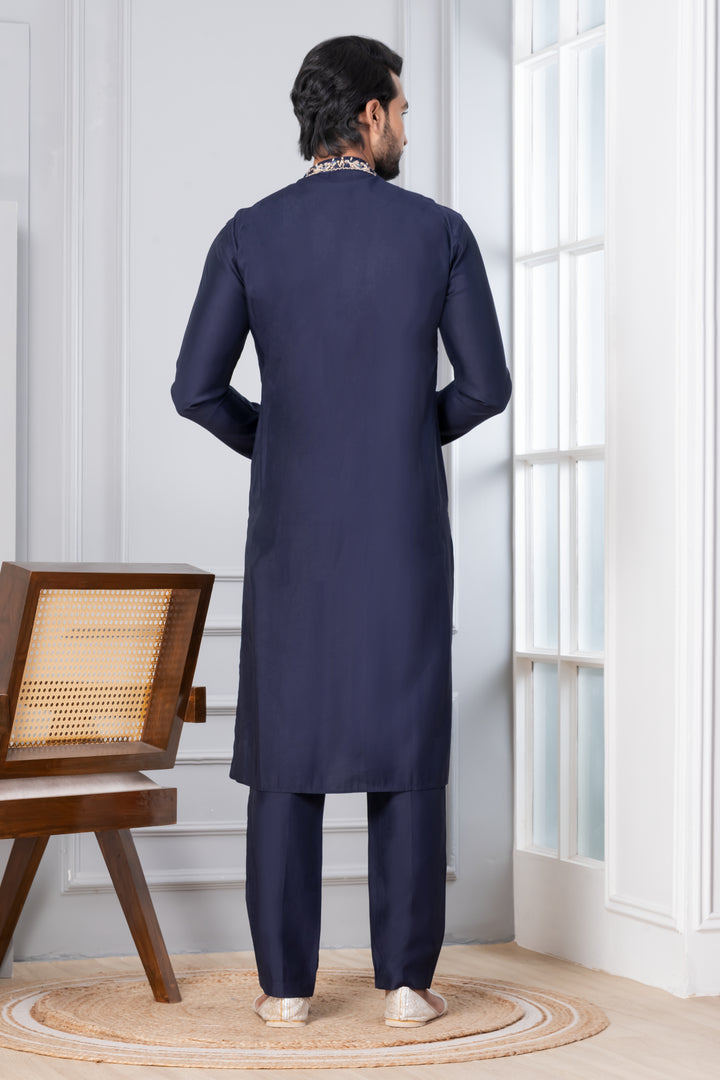 Exude royal charm with this Regal Navy Blue Glam Cotton Kurta Pyjama Set, a perfect blend of elegance and traditional artistry.