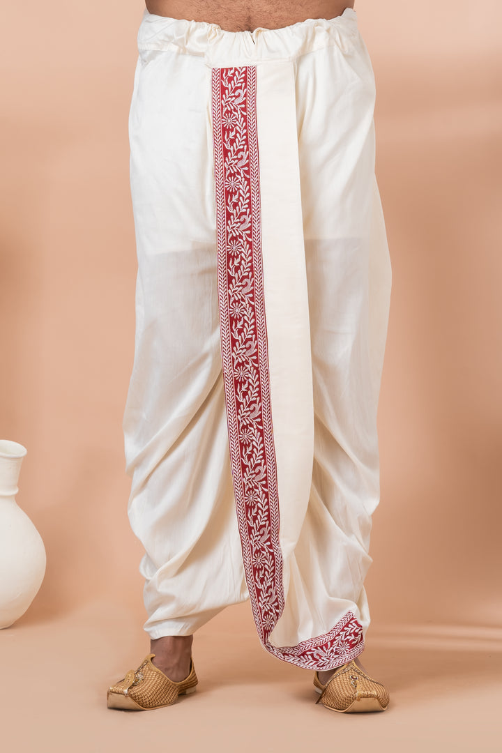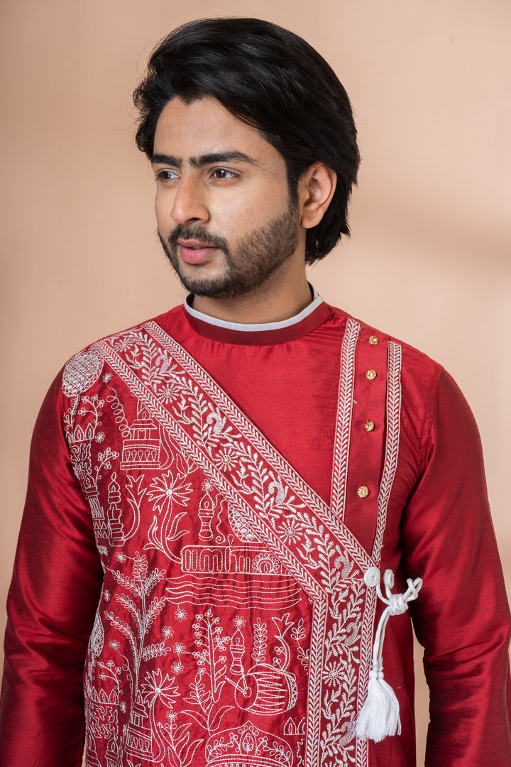 Celebrate the essence of Bengali culture with our Red Embroidered Dhoti Kurta Set, designed to steal the spotlight at every Durga Puja, Diwali, or Poila Boishakh gathering. The kurta is gracefully adorned with traditional temple and floral motifs in ivory thread, extending into a royal asymmetric drape that defines elegance.