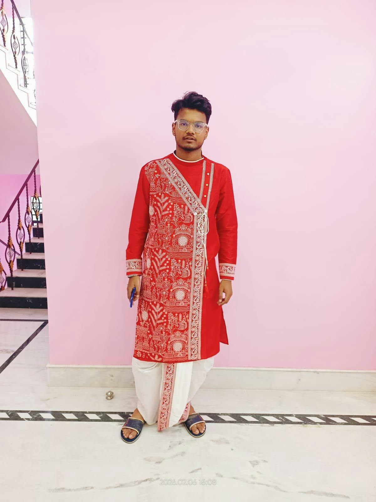 Angasudha Regal Red Bengali Dhoti Kurta Set – Crafted for the Celebrations of Bengal