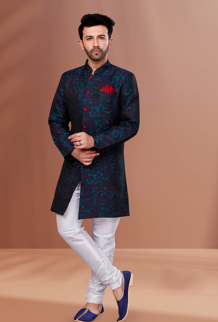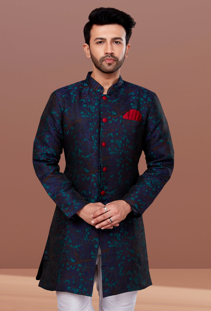 Step into elegance with this striking Indo-Western ensemble from Angasudha, perfect for weddings, receptions, and festive evenings. Crafted from luxurious brocade fabric, the jacket boasts a deep teal-blue base adorned with a subtle floral pattern and highlighted by contrasting red buttons and a stylish pocket square.
