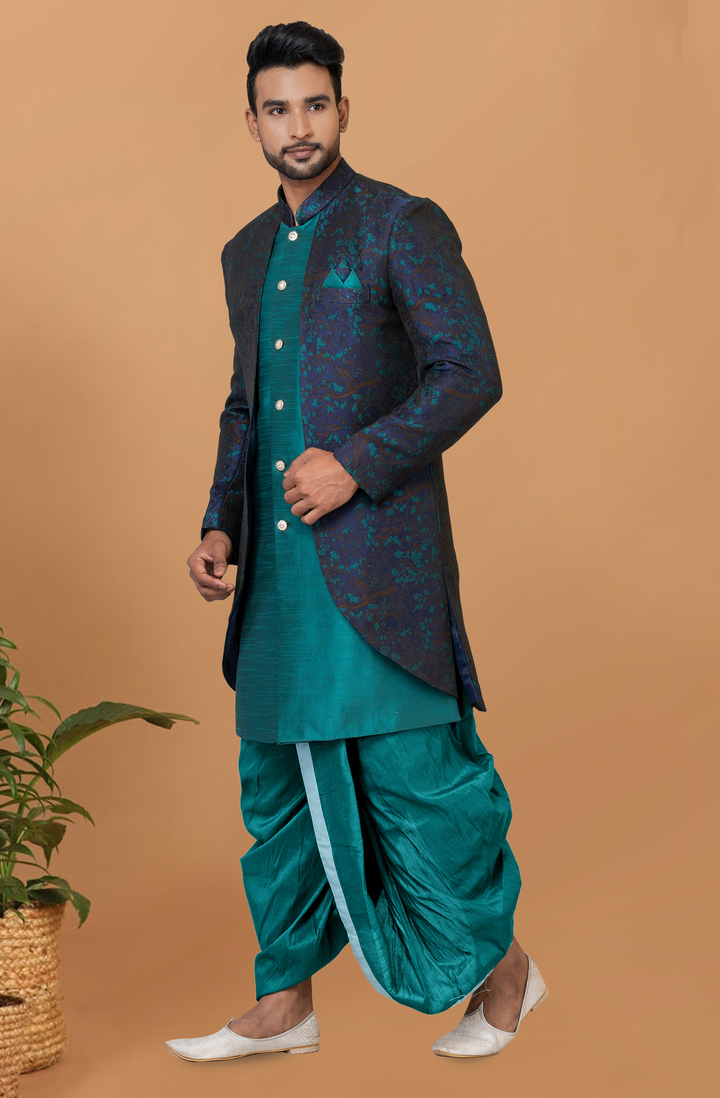 Step into the spotlight with this statement-making Indo-Western ensemble from Angasudha. Featuring a textured Jacquard Silk long jacket with deep teal floral motifs and a sleek mandarin collar, this outfit is paired with a striking Banarasi Dhupion silk kurta and a coordinated dhoti with contrasting stripe detail.