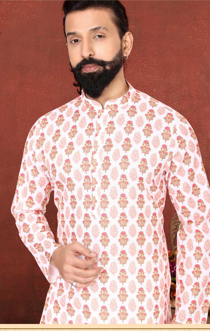 Step into timeless elegance with this Rosé Charm Cotton Kurta Set. The kurta features an all-over digital floral print on soft cotton fabric, offering both breathability and refined charm. Paired with a pristine white Dupion Silk pyjama, this ensemble delivers comfort with a touch of luxury.