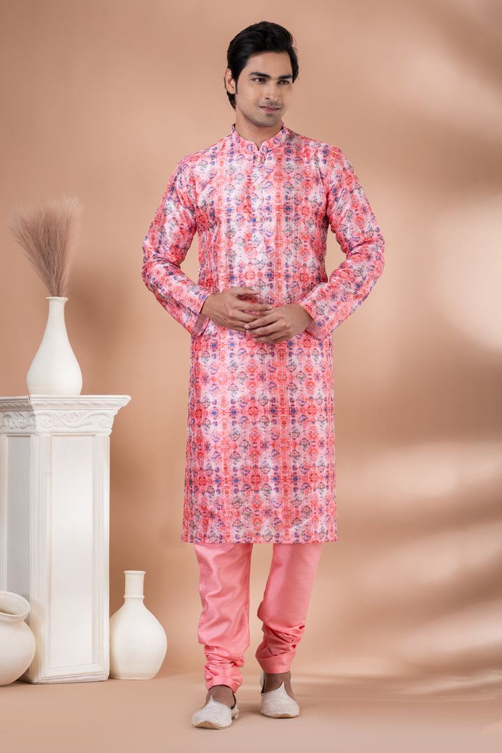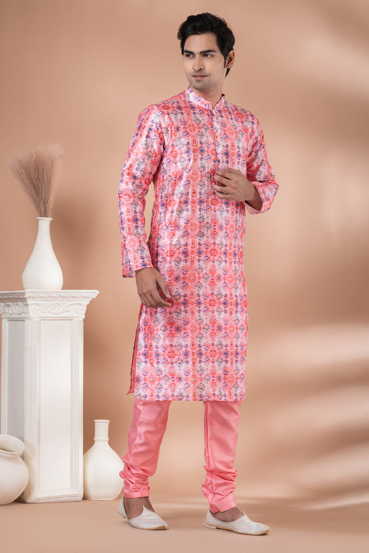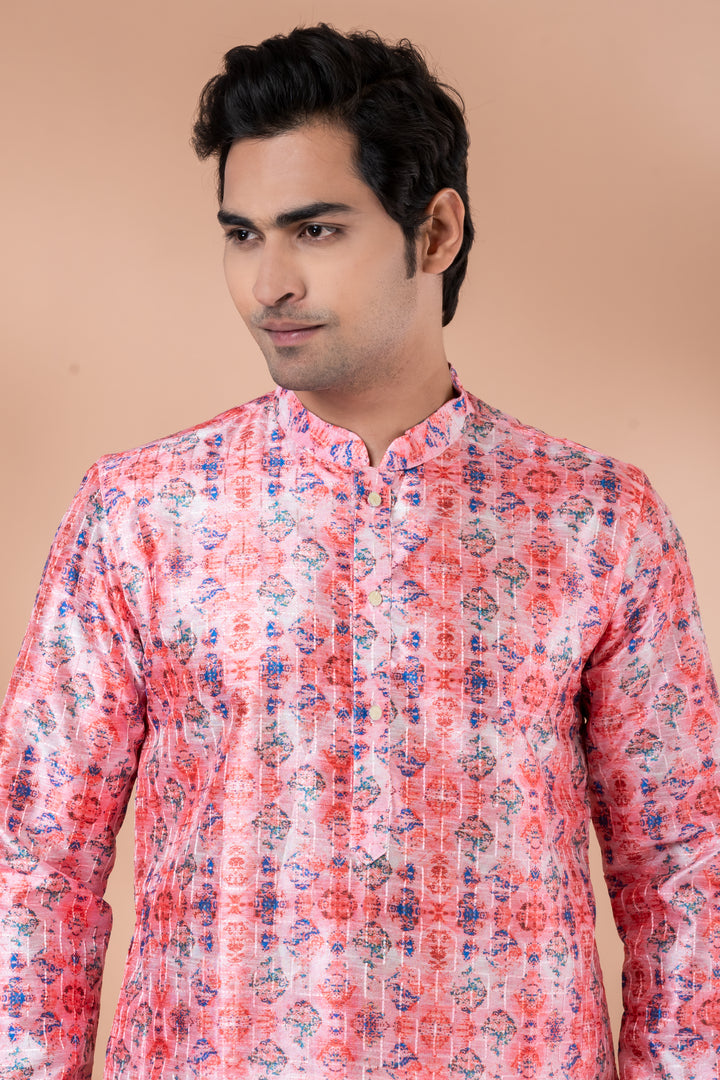 This striking kurta is paired with a rosy peach Dupion Silk Pyjama, creating an eye-catching and youthful look perfect for haldi, festive soirées, or destination weddings.