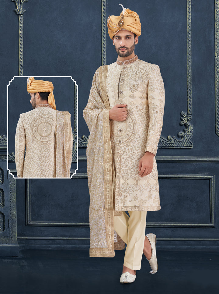 Command regal presence on your special day with this Royal Beige Embroidered Sherwani Set, a masterpiece curated for wedding ceremonies, bridal receptions, and traditional marriage celebrations. Adorned with exquisite floral and paisley motifs, this sherwani stands out with its intricate golden threadwork and an opulent circular motif on the back, adding a majestic visual appeal.