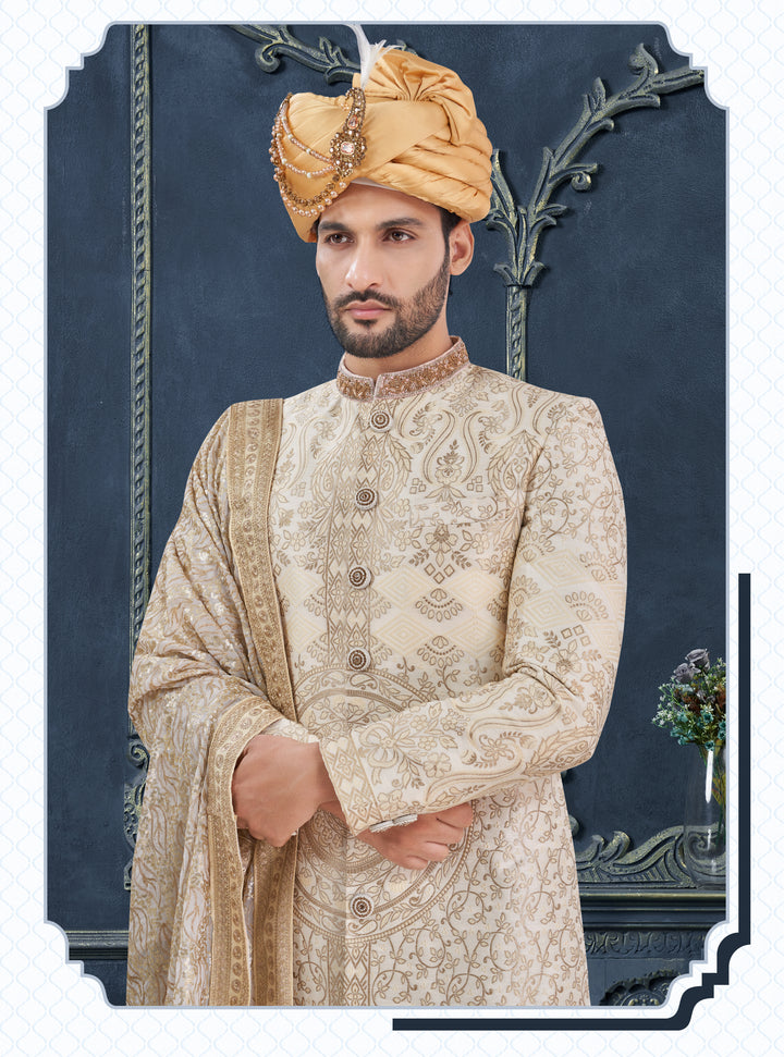 The luxurious look is completed with a golden embroidered dupatta, beige churidar pants, and a striking mustard silk turban embellished with brooch, feather, and pearl strings. Ideal for grooms who wish to blend royal heritage with refined elegance.