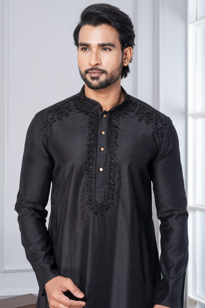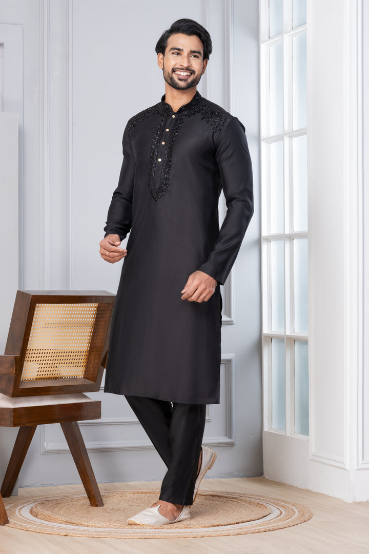 Straight-cut kurta with matching black pyjama for a complete festive ensemble.