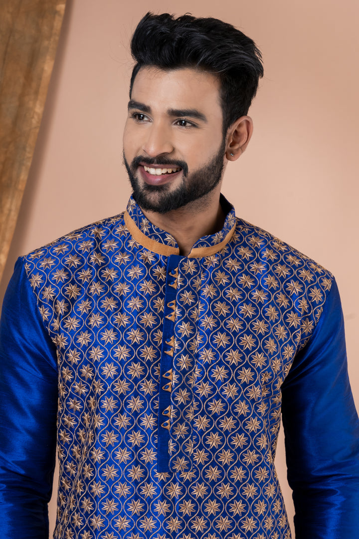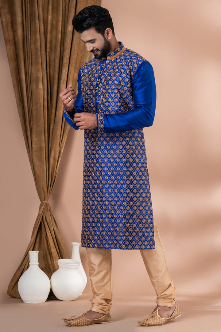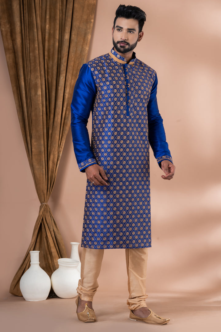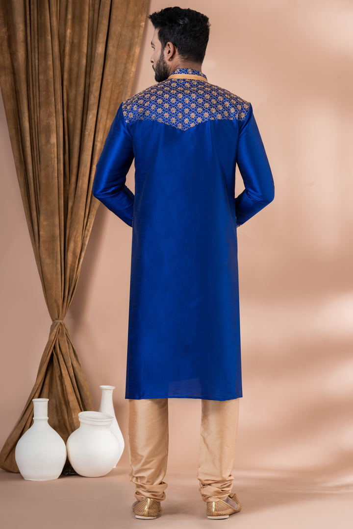 Unleash timeless sophistication in our Royal Blue Banarasi Dhupion Kurta Set. Crafted from rich Banarasi Dhupion silk, this kurta is adorned with intricate golden zari embroidery in a regal floral motif, radiating heritage charm. The deep blue tone is perfectly balanced with contrasting beige churidar pants and finely detailed mojaris. Featuring a mandarin collar, embroidered cuffs, and a sleek front placket, this outfit is ideal for traditional ceremonies, receptions, and grand festive occasions.