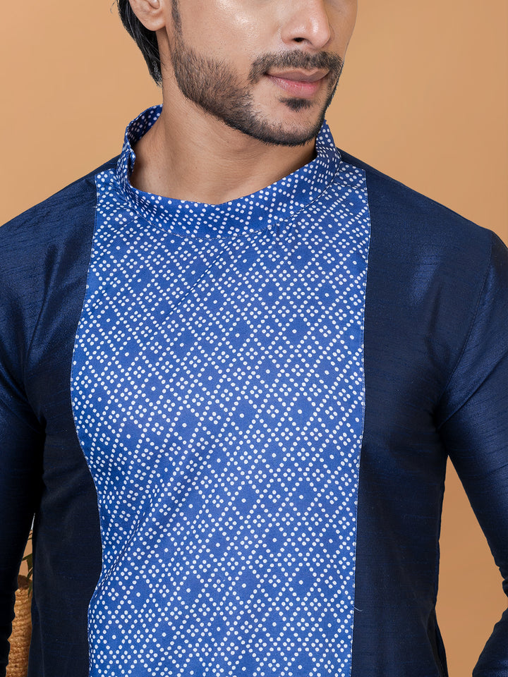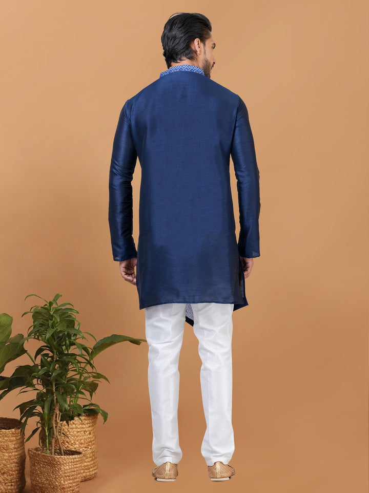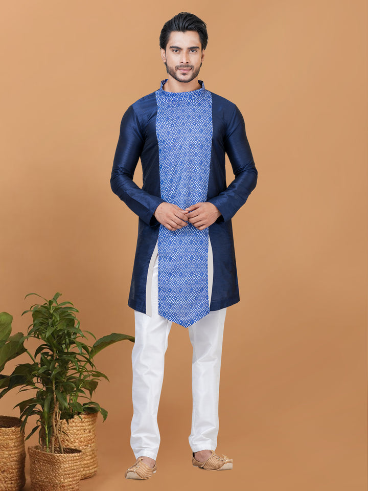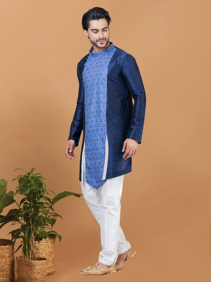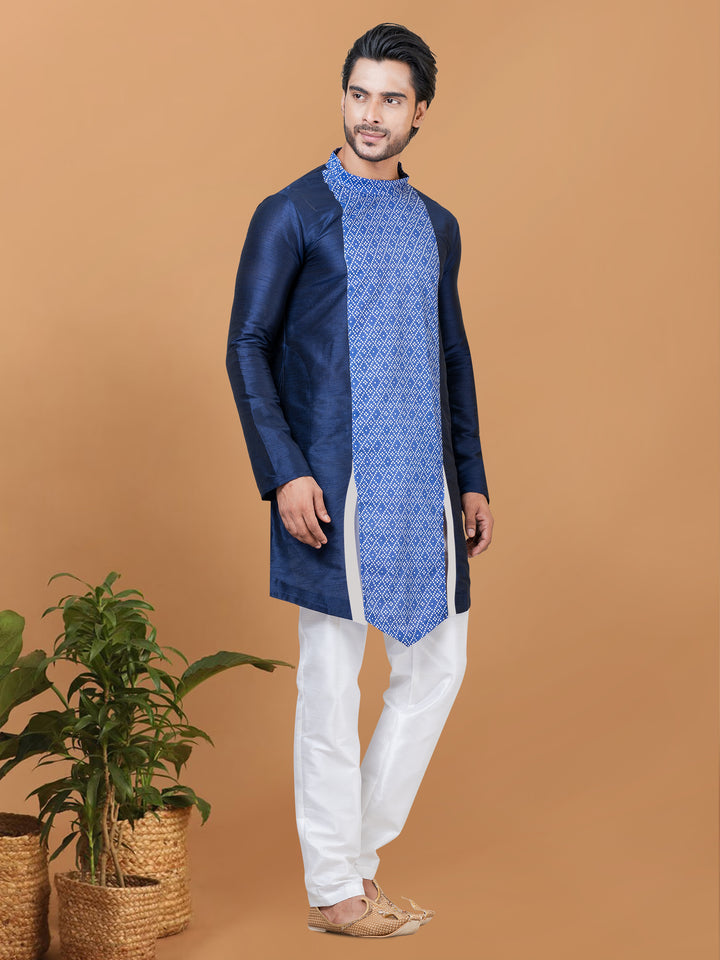 Color: Deep Royal Blue Kurta with white and blue woven patterned front panel and white side inserts