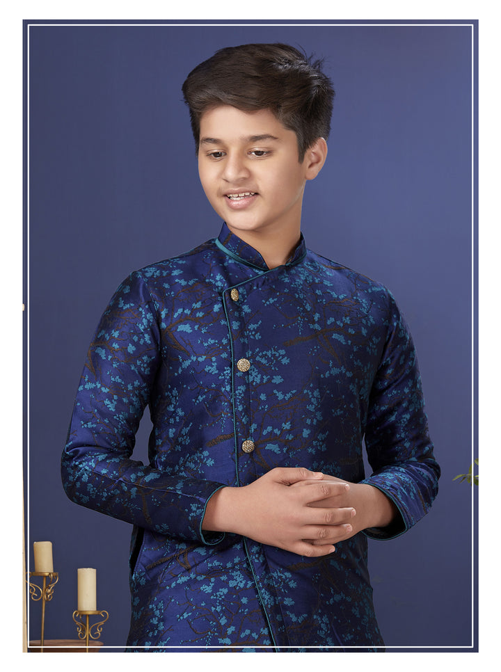 Dress your young one in regal elegance with our Royal Blue Brocade Asymmetric Kurta Set. Crafted from premium brocade fabric, the kurta features a stunning floral pattern in shades of teal, set against a rich blue backdrop. The asymmetrical cut and side-button detailing add a modern twist to traditional charm. Paired with vibrant maroon dhoti-style pants made from soft, breathable fabric, this ensemble promises both style and comfort.