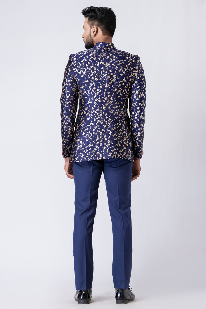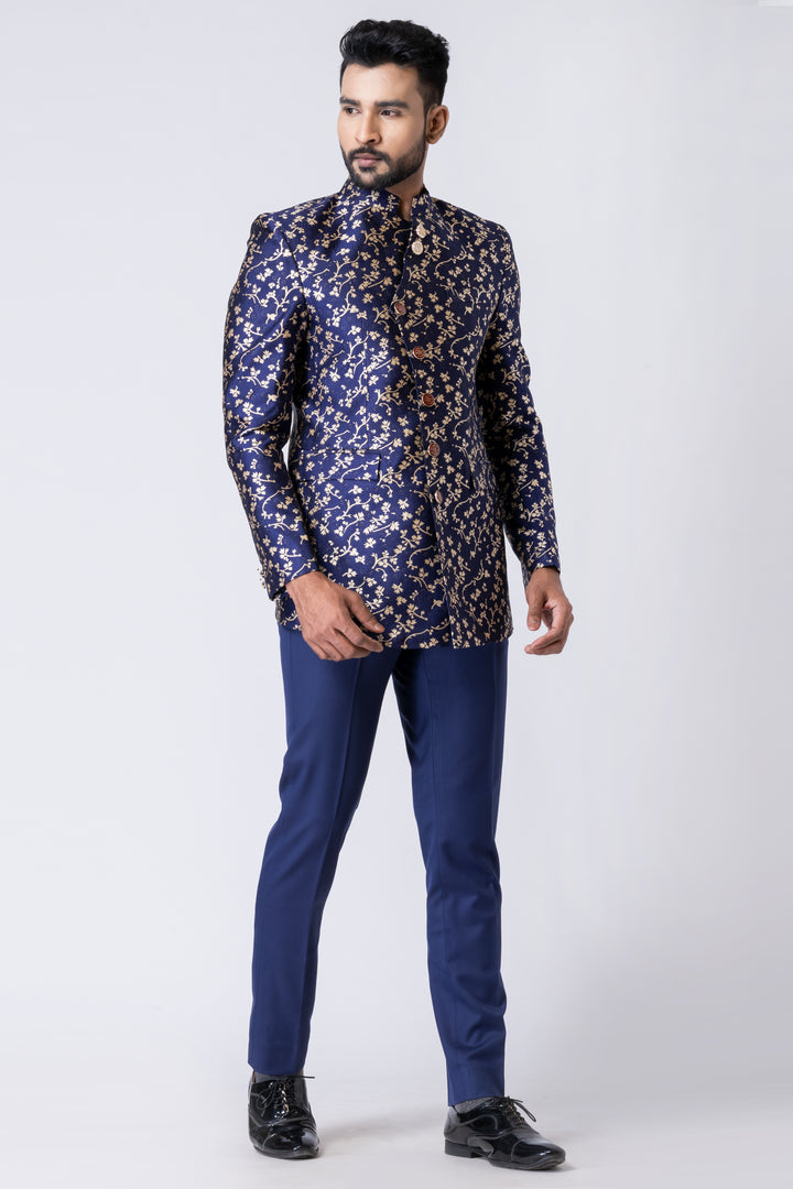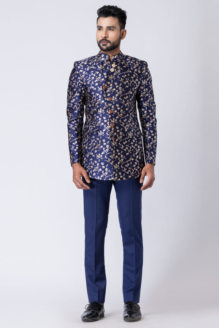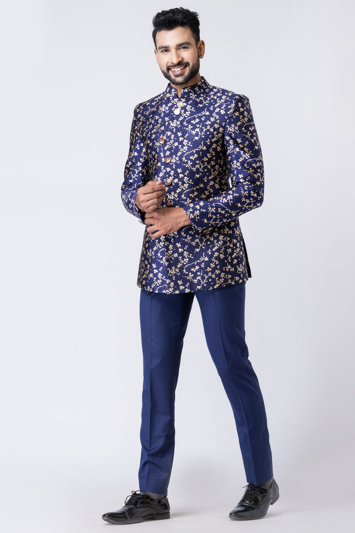 Drape yourself in regal luxury with this Royal Blue Brocade Jodhpuri Suit, a statement ensemble that celebrates grandeur and tradition. Featuring an all-over golden floral brocade pattern on a rich royal blue base, this suit radiates opulence with every detail. The bandhgala collar and ornate buttons elevate the look, making it perfect for special occasions.
