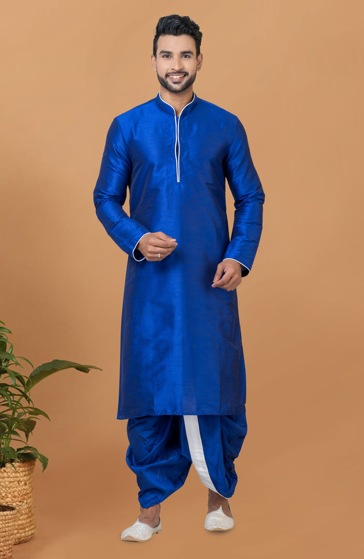 Drape yourself in regal elegance with our Royal Blue Dhoti Kurta Set, a standout ensemble that perfectly balances tradition and modern flair. The kurta, crafted from a premium silk blend, features a deep royal blue tone with crisp white piping on the collar, cuffs, and placket—adding a refined contrast that enhances its bold richness.