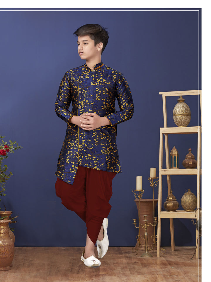 Angasudha Royal Blue & Mustard Gold Brocade Asymmetric Kurta with Maroon Dhoti Pants – Boys' Festive Wear Set