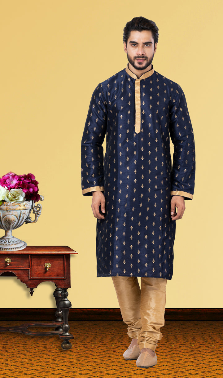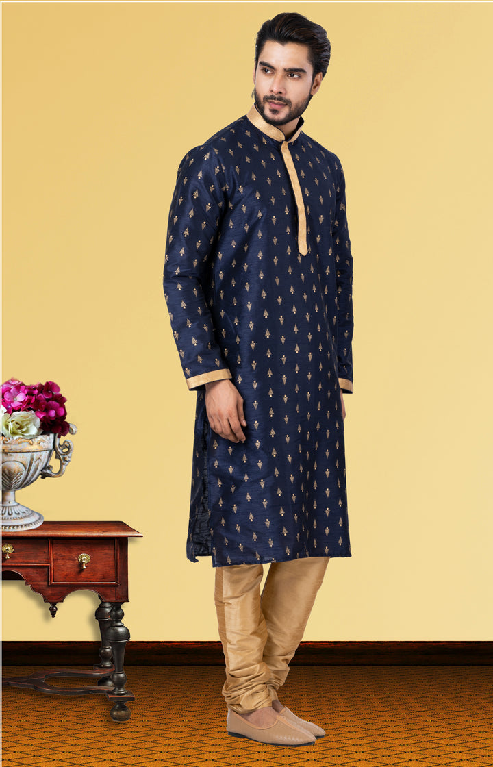 Drape yourself in timeless sophistication with this Royal Blue Dupion Silk kurta, accentuated by delicate golden tree motifs and sharp contrast detailing on the collar, placket, and cuffs. Paired with a classic Golden Dupion Silk pyjama, this ensemble radiates elegance, making it a staple for every festive wardrobe.