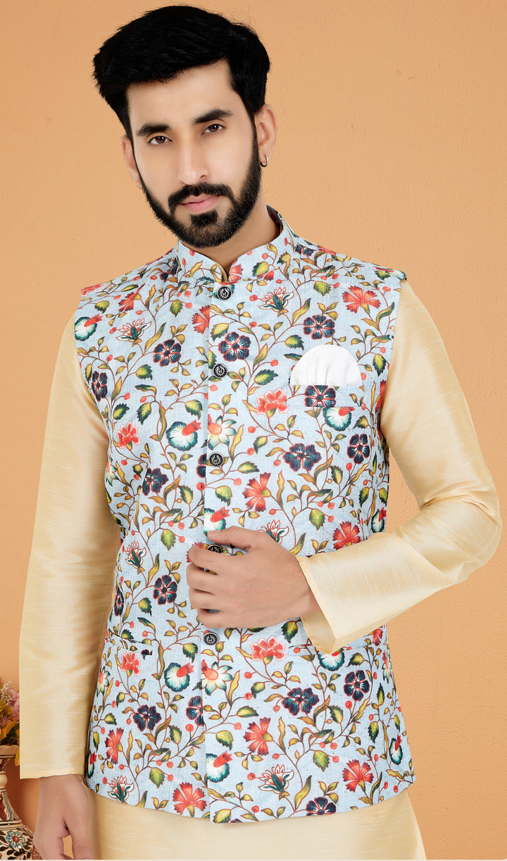 Brighten your ethnic wardrobe with this golden kurta pyjama set paired with a stunning floral embroidered waistcoat. Crafted from high-quality art silk, the kurta and pyjama offer a rich texture and shine. The white Nehru jacket bursts with vivid multicolor floral embroidery, making it a standout piece for any festive occasion.