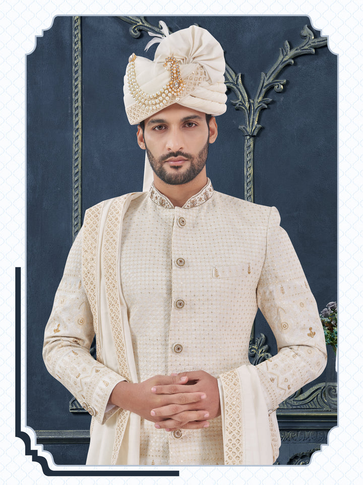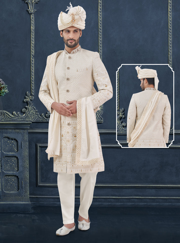 Angasudha Royal Ivory Zari Embroidered Sherwani Set – Classic Groom Collection