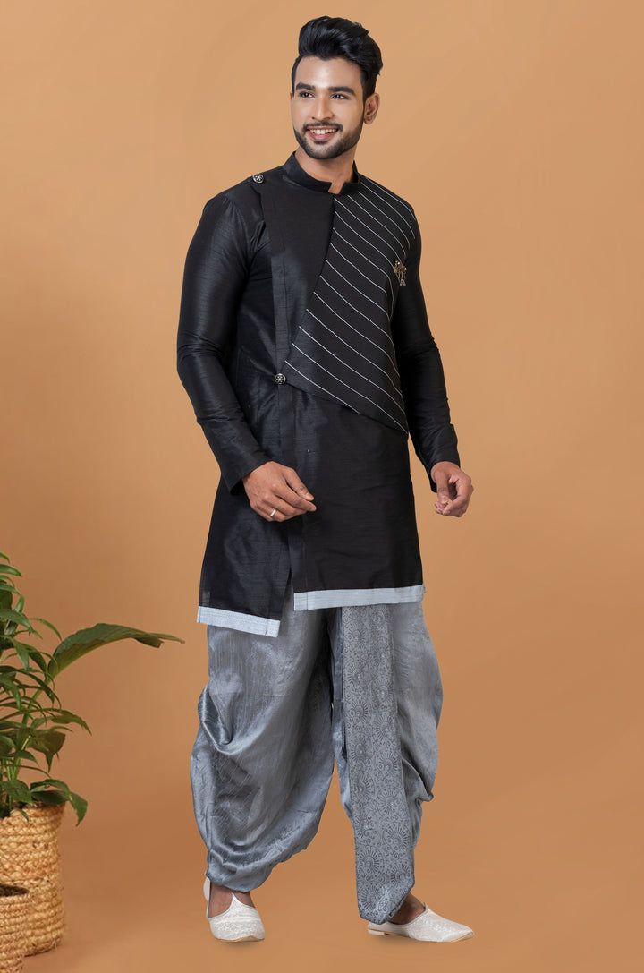 Step into sophistication with our Royal Noir Asymmetric Kurta with Embroidered Dhoti – a showstopper ensemble that effortlessly merges modern design with ethnic elegance. The black silk blend kurta is tailored with an offbeat asymmetric cut, adorned with sleek diagonal pinstripes and metallic button detailing at the shoulder. A subtle brooch adds an extra touch of class.