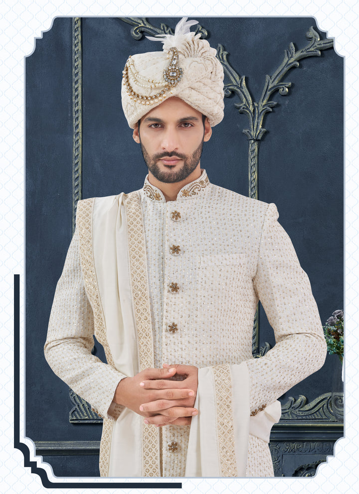 Angasudha Royal Off-White Embroidered Sherwani Set – Perfect for Marriage & Bridal Occasions