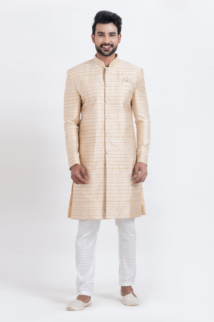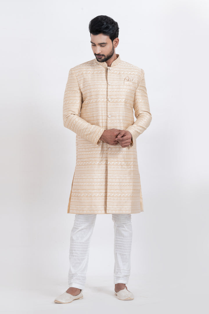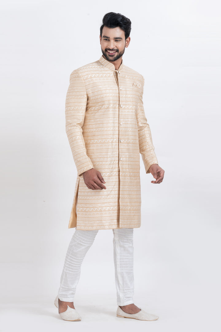 Grace meets grandeur in this Royal Pearl Beige Indo Western Set, designed for the modern groom and festive connoisseur. The top features a soft beige brocade fabric with intricate self-woven patterns that exude subtle opulence. The elegant mandarin collar, full button-down closure, and stylized pocket square detailing enhance the aristocratic charm. Complemented by a white churidar, this ensemble is a regal pick for traditional celebrations.