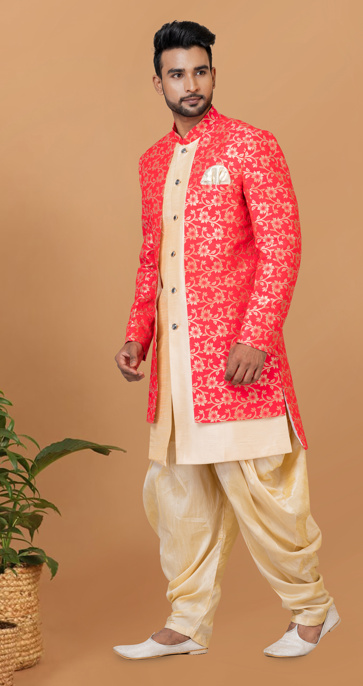 🔸 Inner Kurta & Dhoti Fabric: Cream-toned Banarasi Dhupion Silk, offering a graceful flow and luxurious touch