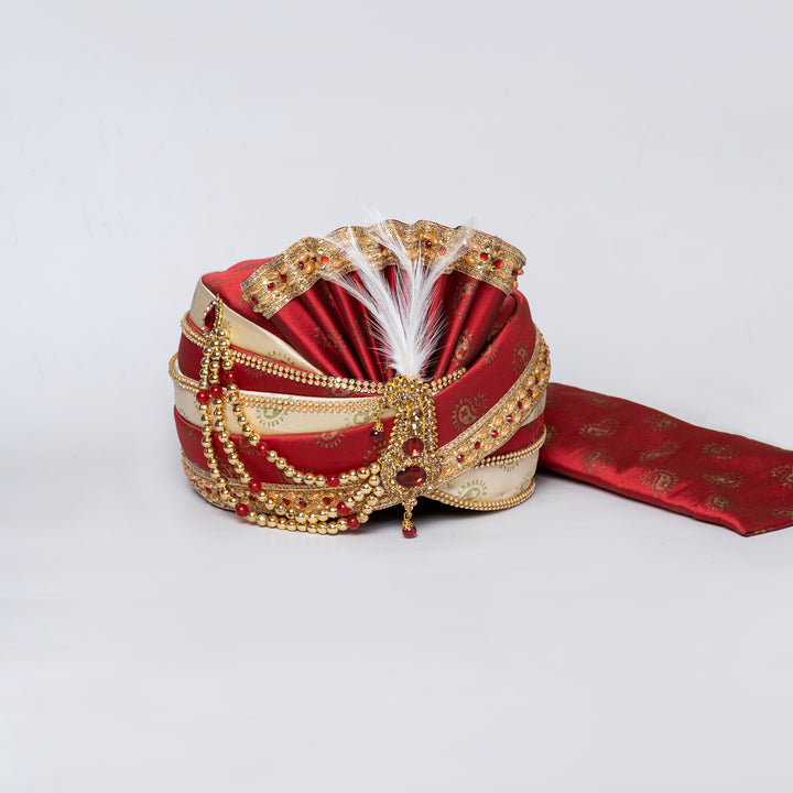 Angasudha Royal Red & Cream Groom Pagdi with Golden Embroidery and Feather Brooch