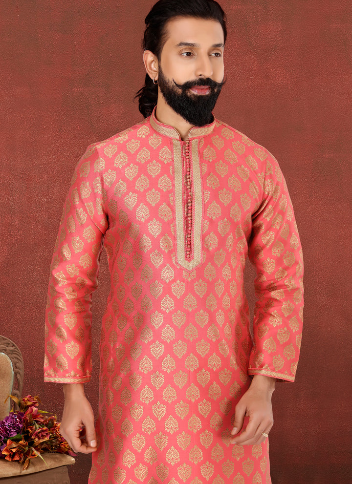 Make a bold and festive statement with the Angasudha Royal Rose Kurta Set, a perfect fusion of vibrant color and rich tradition. The kurta is crafted from premium Jacquard Silk fabric in a radiant rose-gold hue, featuring an all-over gold zari woven motif that speaks of timeless grandeur. Intricate embroidery along the neckline adds a regal touch.