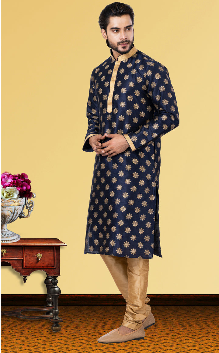 Make a majestic entrance in this Navy Blue Dupion Silk kurta, highlighted with elaborate golden sunburst motifs and regal contrast accents on the collar, cuffs, and placket. Teamed with a shimmering Golden Dupion Silk pyjama, this ensemble speaks volumes of festive grandeur and traditional strength.