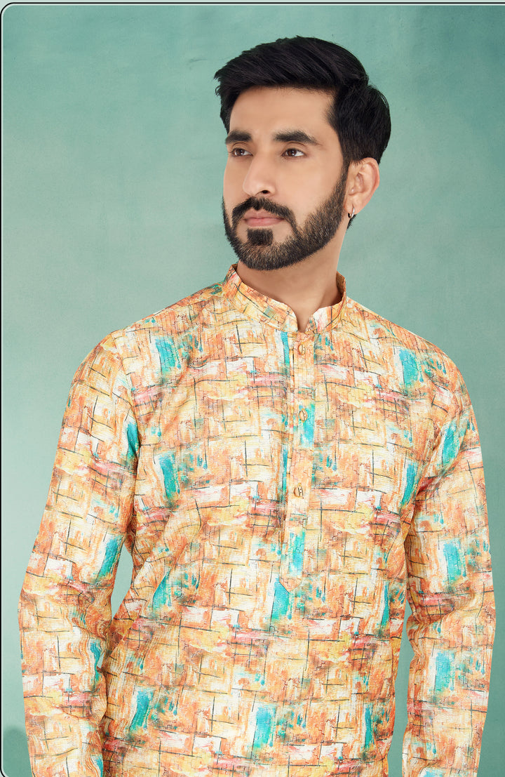 Turn heads with this Artistic Abstract Printed Kurta, drenched in earthy tones of ochre, teal, and hints of coral. This kurta's brushstroke-inspired design evokes a painterly charm, making it a perfect pick for the modern man with a creative soul. Paired with a crisp white Dupion Silk Pyjama, it offers a bold yet balanced ethnic statement.