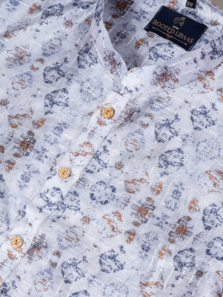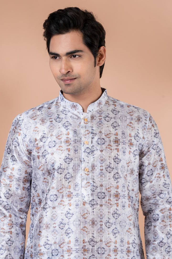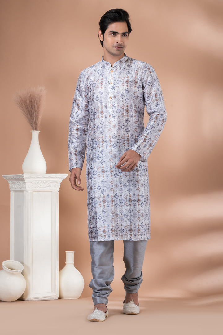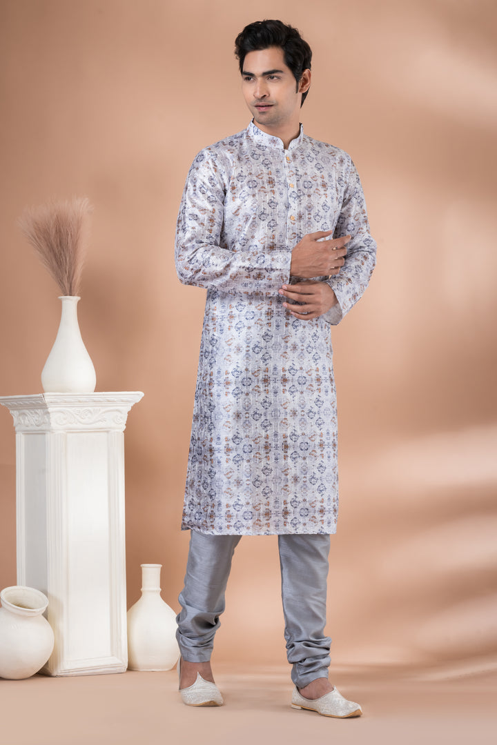 Add a refined flair to your ethnic ensemble with the Angasudha Silver Grey Kurta Set. Designed for the modern man who values elegance, this kurta is made from high-quality Mono Fabric and features a subtle yet striking digital print in shades of silver, blue, and copper. The geometric-inspired motifs and sleek crochet detailing offer a tasteful blend of traditional art and contemporary appeal.