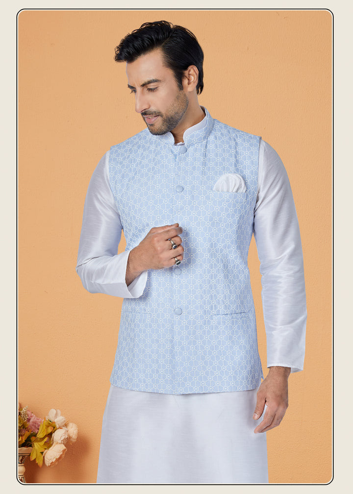Add a refreshing pop of elegance with the Angasudha Sky Blue Geometric Printed Waistcoat Set. The standout feature is its soothing sky blue hue and contemporary geometric motif, paired flawlessly with a white art silk kurta and churidar pyjama. Designed with a mandarin collar and a sleek front button placket, this set makes a perfect pick for daytime events and festive get-togethers.