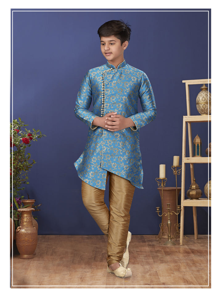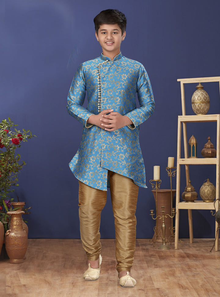Brighten up festive moments with our Sky Blue and Gold Brocade Asymmetric Kurta Set. Made from luxurious brocade fabric, this kurta features an intricate gold floral weave over a serene sky blue base. The stylish asymmetric hemline, complemented by an elegant side-button design, adds a modern edge to traditional styling. Paired perfectly with golden churidar pants crafted from a soft silk blend, this ensemble ensures a royal and comfortable fit for your young prince.