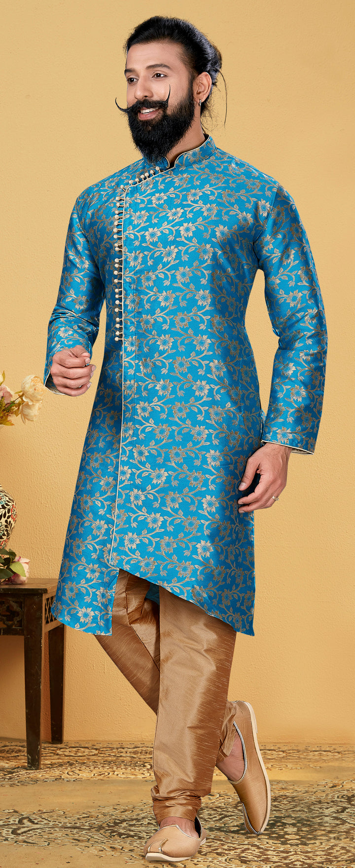 Top: Sky Blue Jacquard Silk with golden woven floral patterns