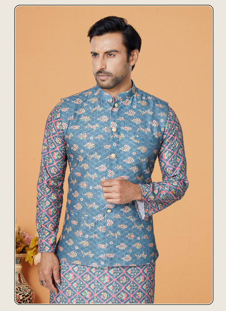 Angasudha Steel Blue Floral Digital Print Mono Polyester Waistcoat