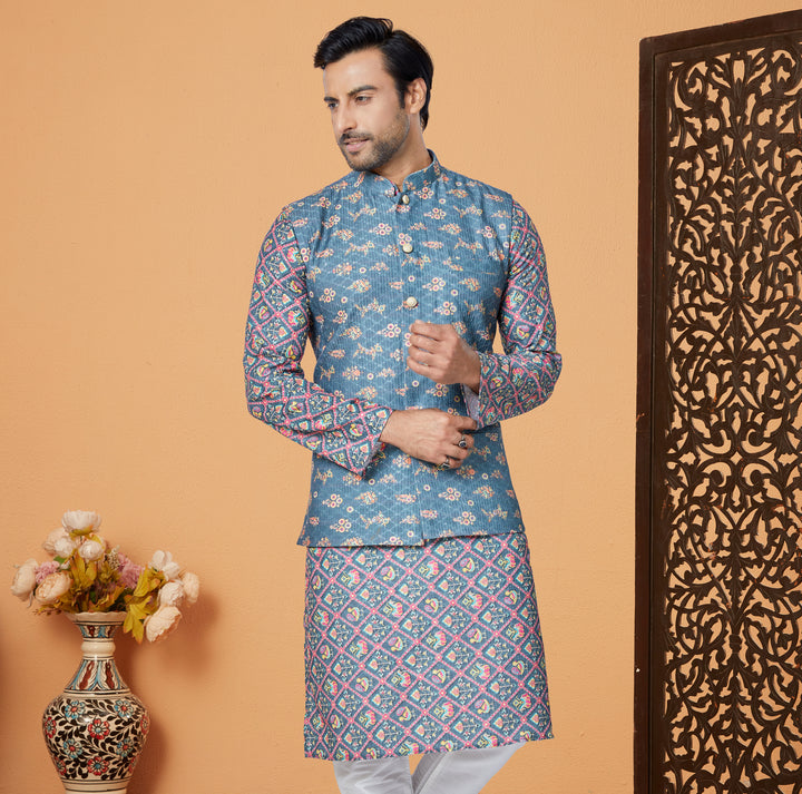 Step into effortless sophistication with this Angasudha Nehru jacket, tailored in a refined steel blue Mono Polyester fabric with delicate floral digital prints. The subtle ribbed texture enhances the visual appeal, while the wooden-style buttons and Mandarin collar lend it a timeless ethnic charm. Ideal for layering over printed or solid kurtas, this versatile waistcoat is a must-have for festive and semi-formal occasions.
