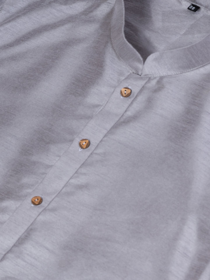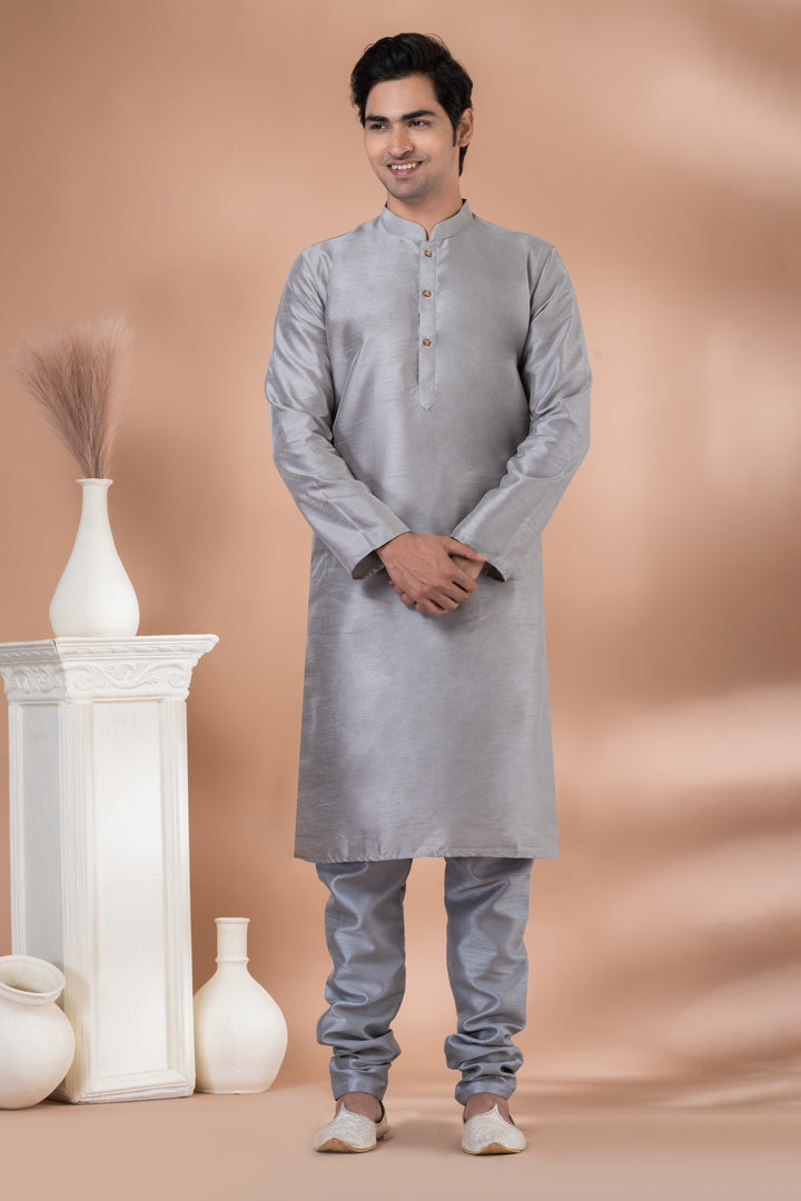 For the man who values refined minimalism, the Angasudha Steel Grace Kurta Set delivers a look that is both modern and timeless. Crafted from premium Dupion Silk, the kurta features a polished steel grey tone with a soft sheen and clean finish. Wooden buttons on the placket add a touch of rustic elegance, enhancing its classic appeal.