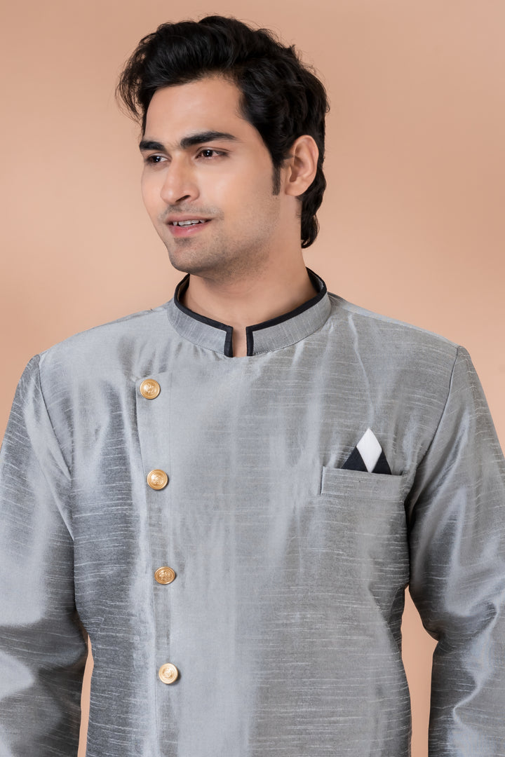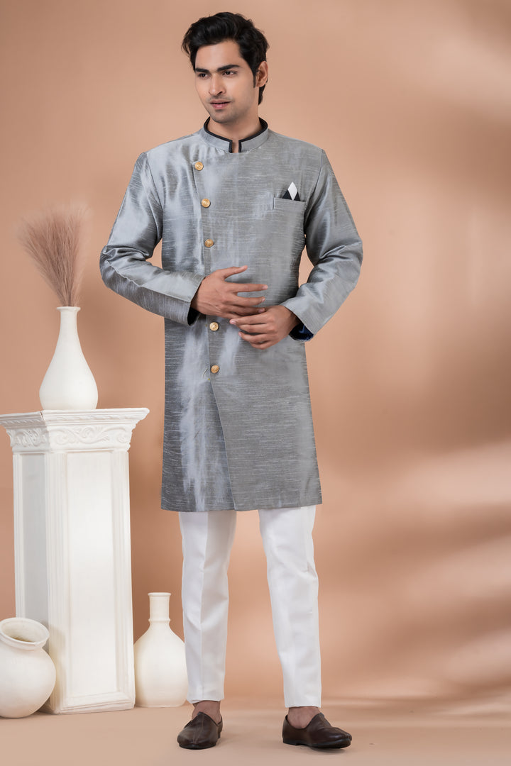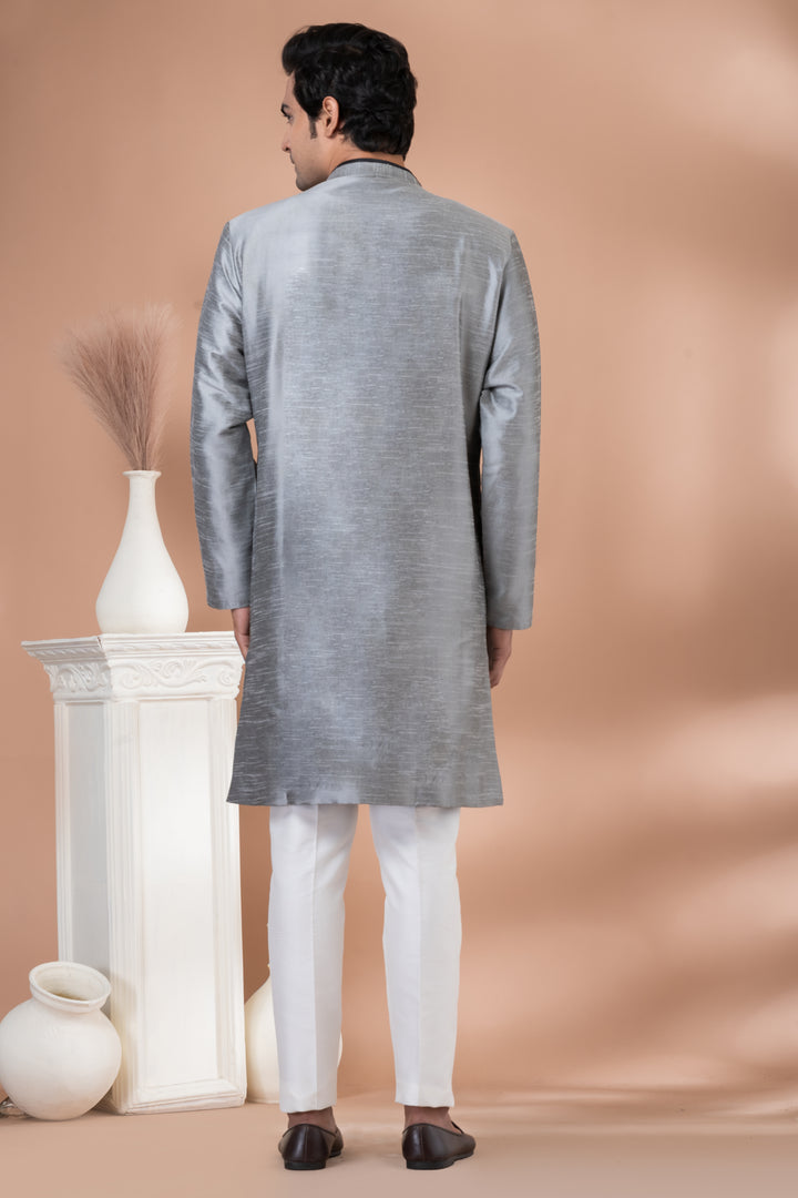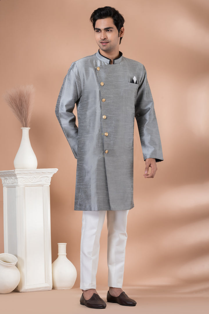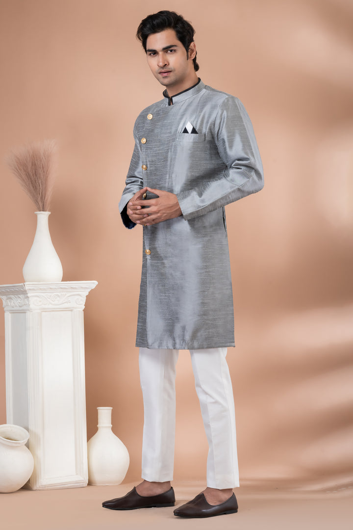 Elevate your occasion wear with this Steel Grey & White Contemporary Indo-Western Set, crafted for the modern gentleman who prefers elegance with a sharp finish.