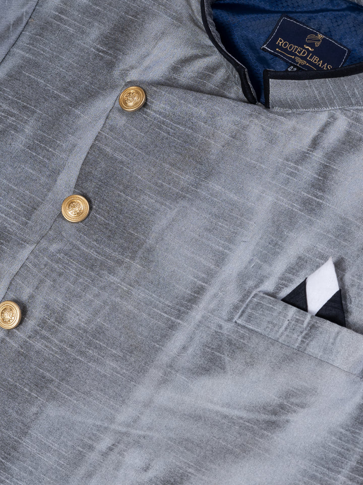 Top Fabric: Polished Steel Grey Silk-Blend with a subtle textured shine, accented with gold embossed buttons and a refined black collar piping.