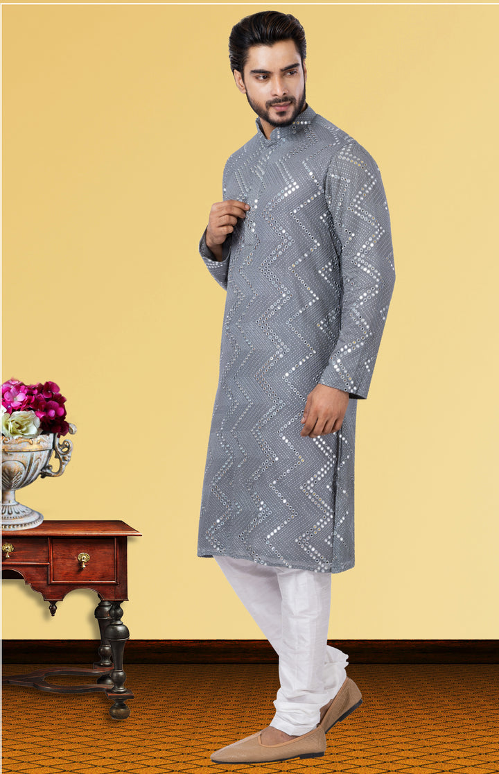 Turn heads in subtle sophistication with this Angasudha kurta set, tailored in a rich steel grey georgette base. Embellished with bold zigzag mirror work across the front, it combines classic craftsmanship with a contemporary edge. Paired with crisp white dupion silk pyjama, it's your perfect pick for elegant festivities.