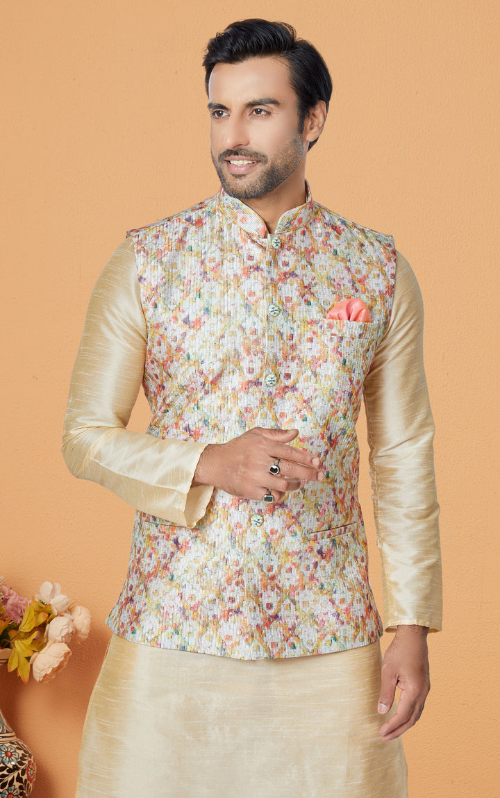 Embrace vibrant festivity with this elegant beige kurta pyjama set paired with a pastel floral waistcoat. Made from premium art silk, the kurta and pyjama offer a graceful, lustrous finish. The Nehru-style waistcoat features soft peach-pink floral prints with a subtle shimmer and an accent pocket square — perfect for ceremonies with a romantic or celebratory vibe.