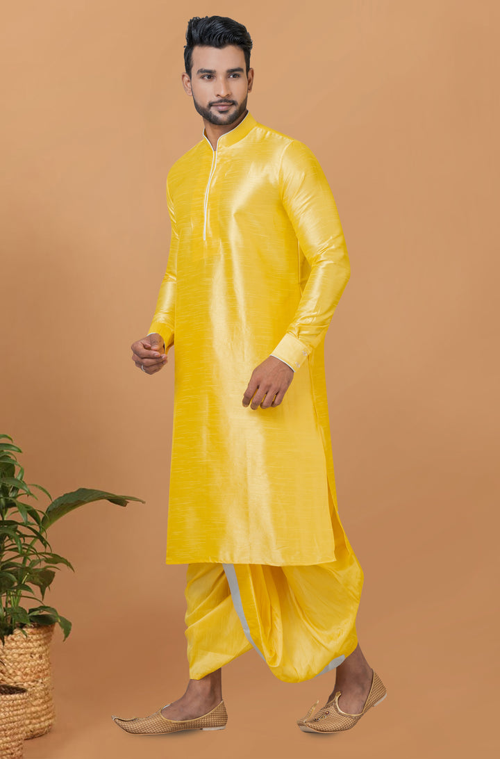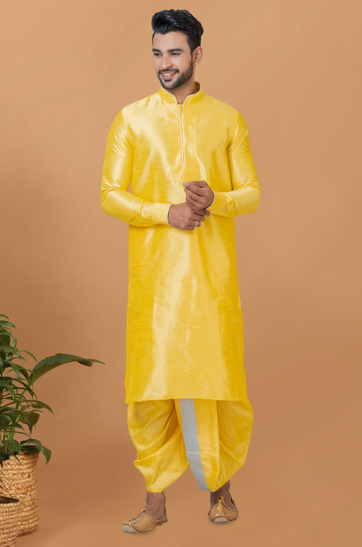 Infuse your festive wardrobe with vibrant charm through our Sunshine Glory Dhoti Kurta Set, a dazzling choice for joyful occasions. The kurta, in a radiant yellow tone, is crafted from a rich silk blend and styled with a mandarin collar and elegant white piping along the neckline and cuffs—bringing a refreshing contrast to the vibrant base.