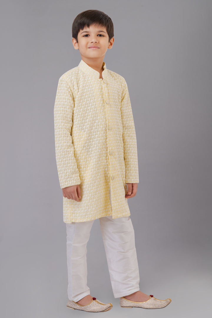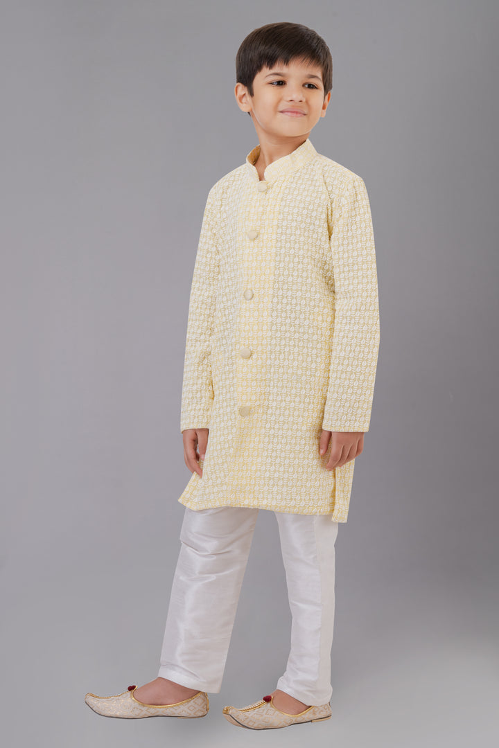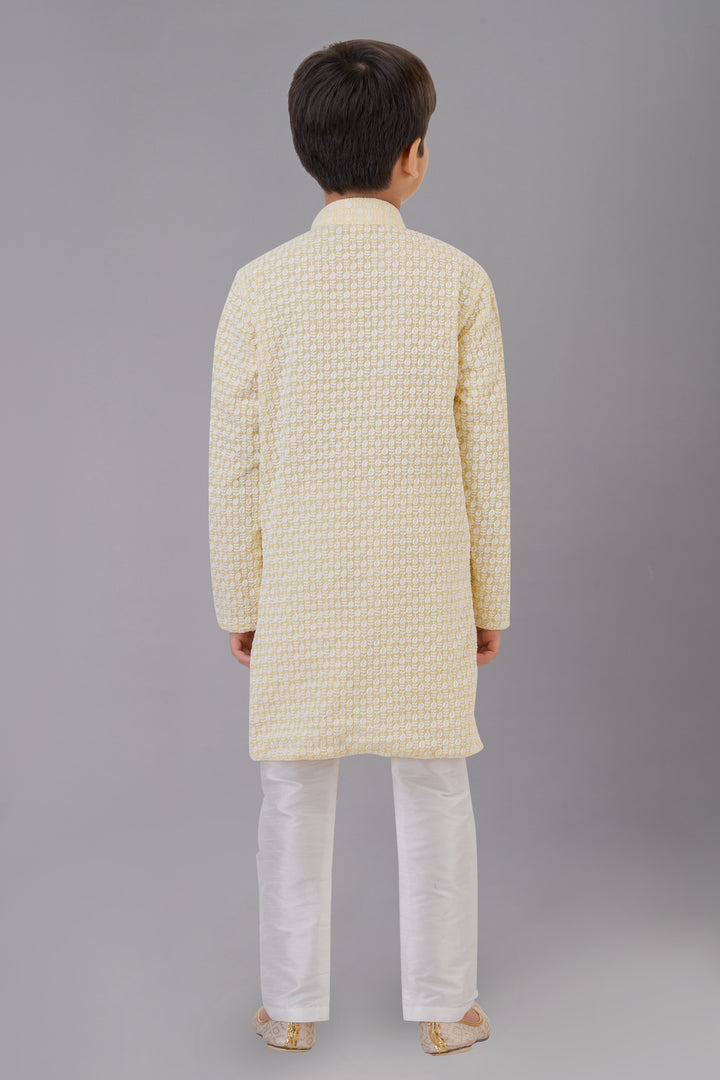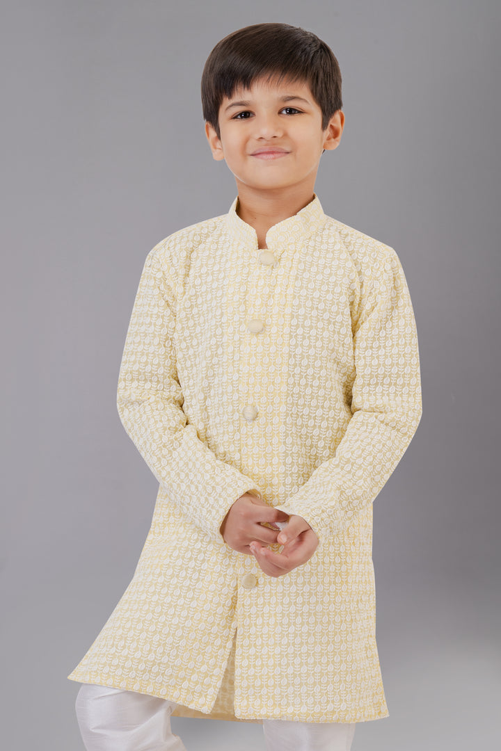 Let your little one shine bright in traditional style with this Sunshine Yellow Kurta Pajama Set for Boys. Designed with intricate white ethnic motifs, this kurta is paired with a crisp white pajama for a timeless and elegant look. The subtle yellow hue adds a joyful charm, making it a perfect outfit for festive celebrations, weddings, or cultural gatherings.