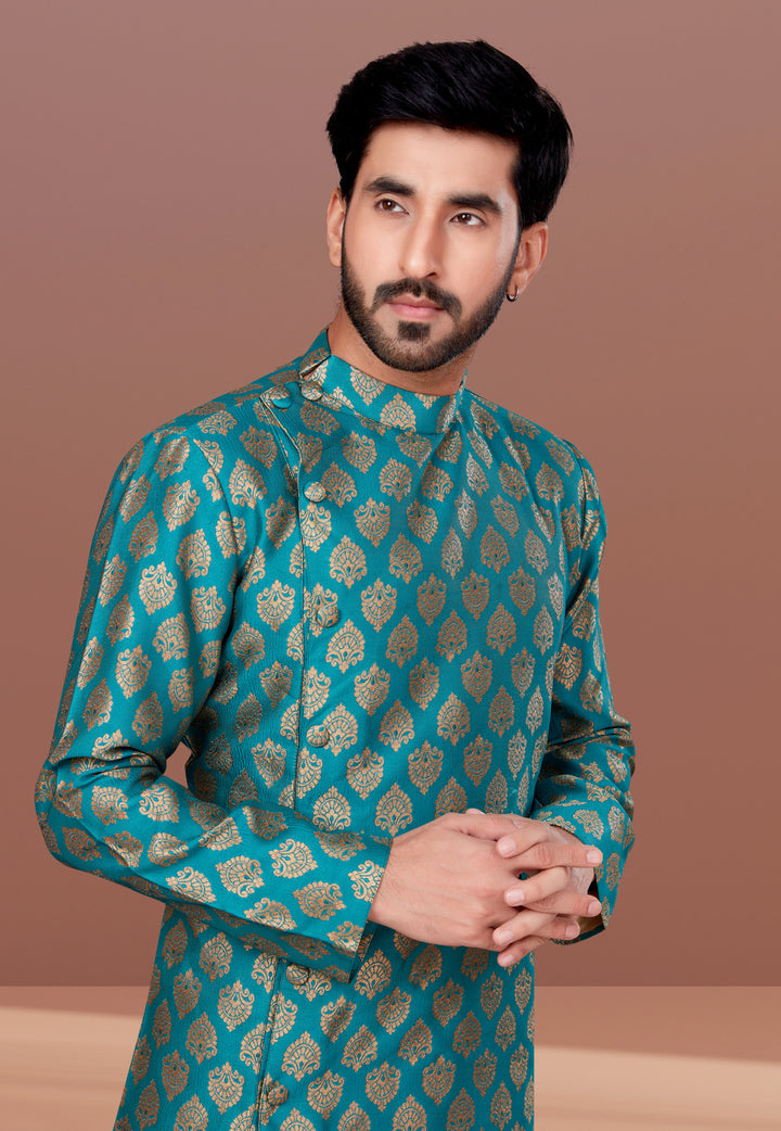Angasudha Teal Blue Banarasi Brocade Indo-Western with Golden Dhoti