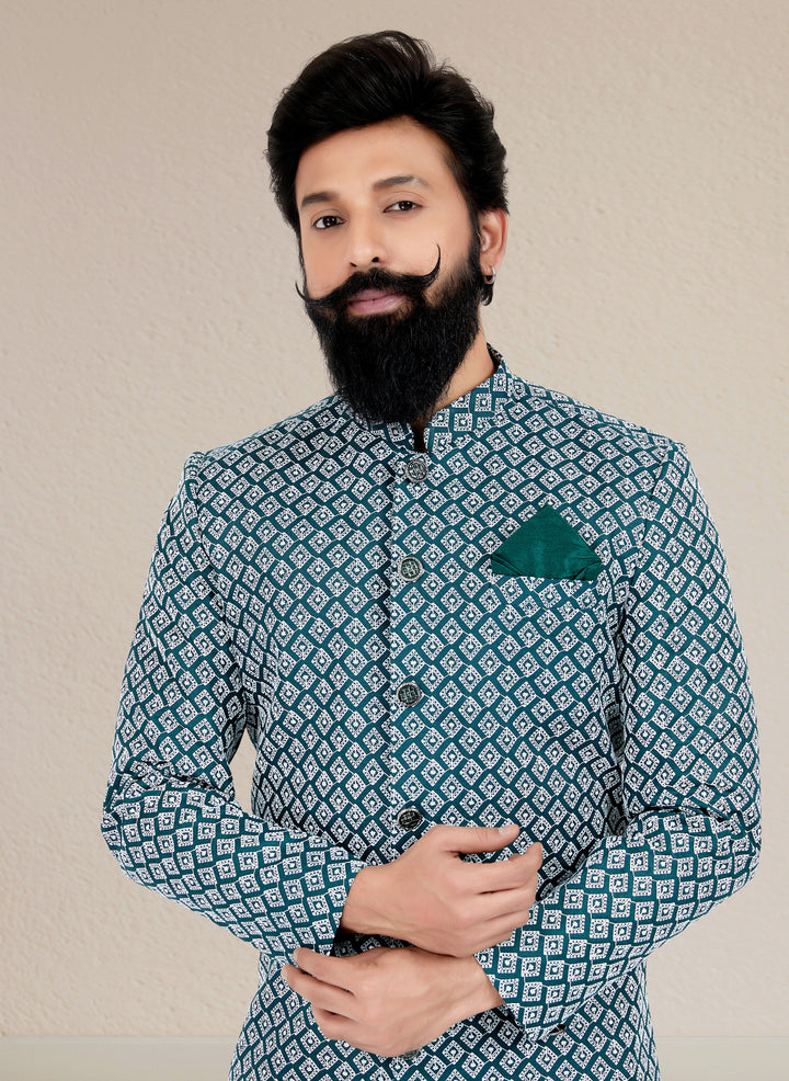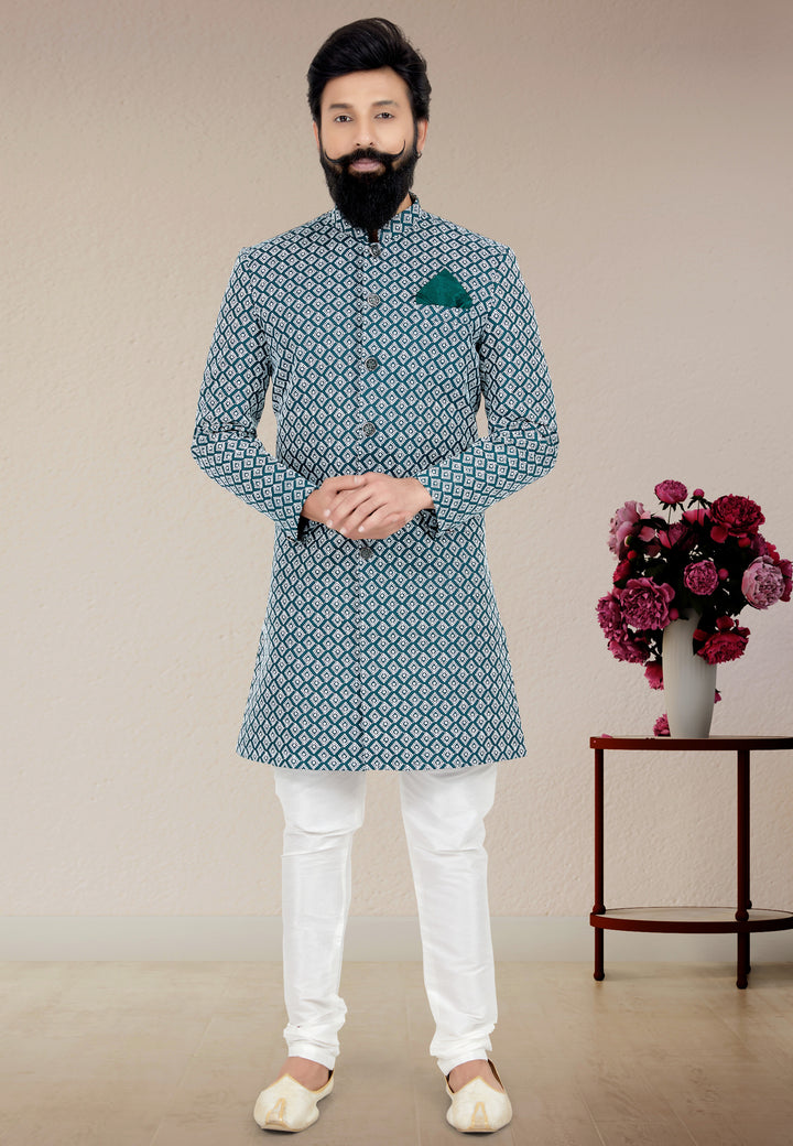 Angasudha Teal Blue Printed Indo Western Set for Men