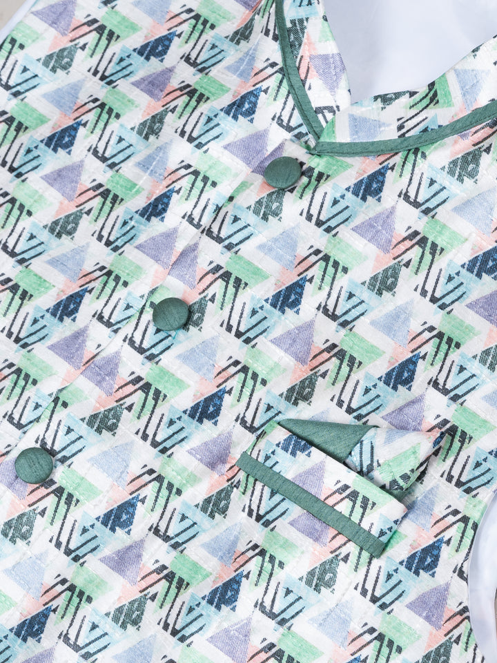 Elevate your ethnic wardrobe with this refined ensemble from Angasudha. Crafted for modern elegance, the outfit features a teal green Banarasi silk kurta and pyjama, offering a rich texture and luxurious finish. The look is enhanced by a white printed silk Nehru jacket adorned with a geometric multicolor pattern, adding a vibrant yet sophisticated twist.