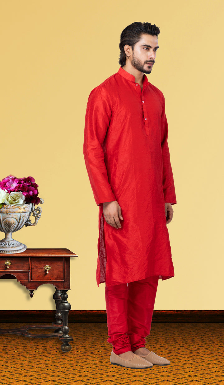 Celebrate tradition with bold flair in this Vibrant Red Dupion Silk Kurta Pyjama Set from Angasudha. With its fiery red hue and natural silk luster, this ensemble is sure to make a statement at any festive gathering. The kurta features a smart mandarin collar and front placket, giving it a refined ethnic silhouette. Paired with a matching churidar pyjama, this set offers classic comfort with a touch of royal charisma.