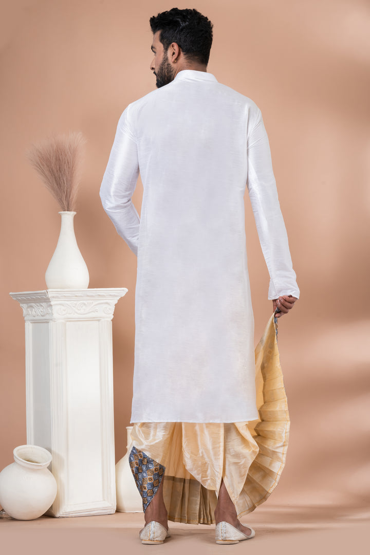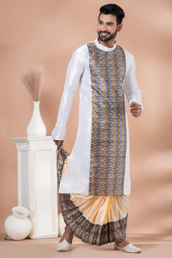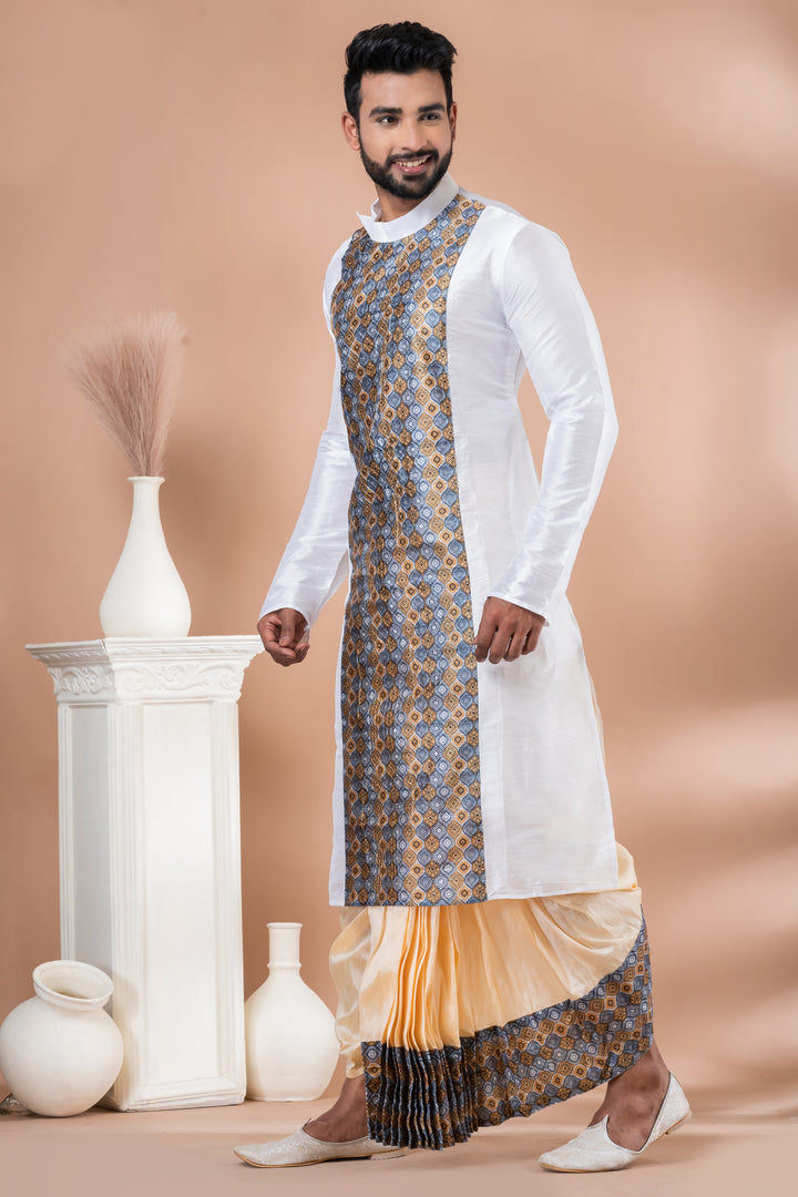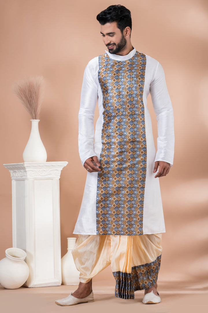 Angasudha White & Beige Printed Panel Dupion Silk Dhoti Kurta Set