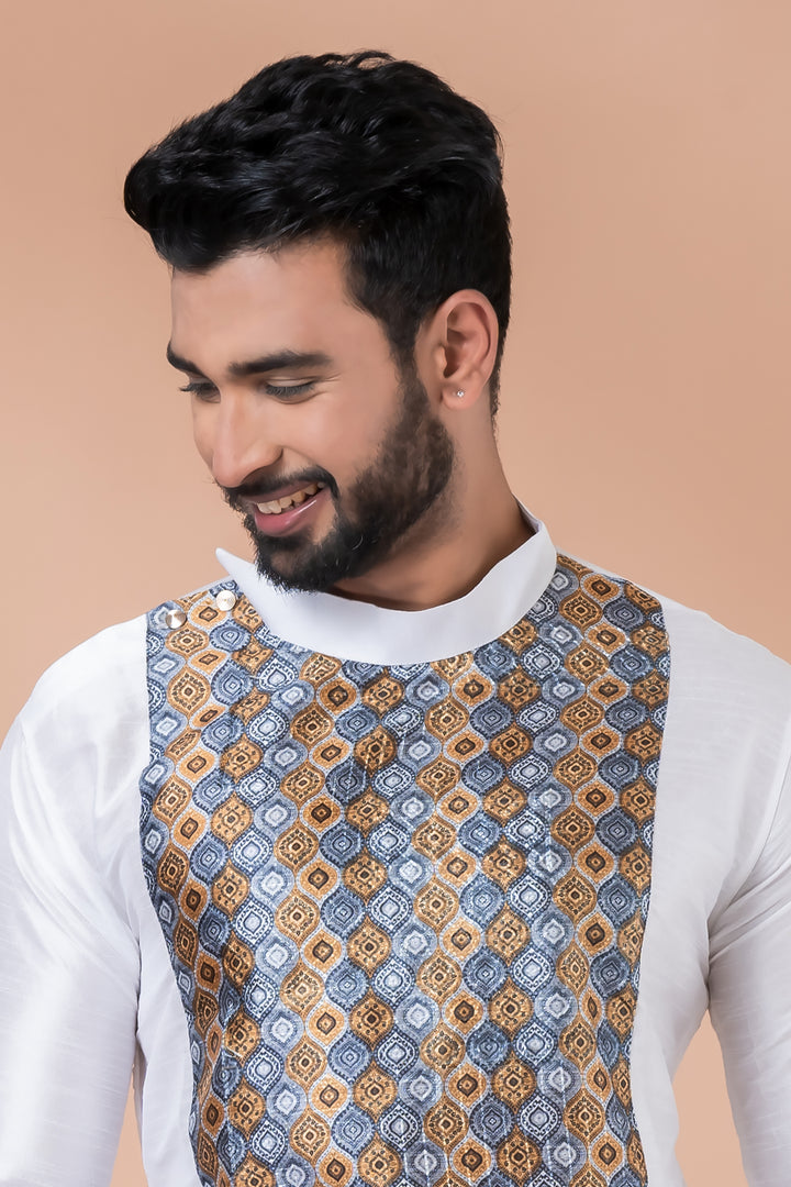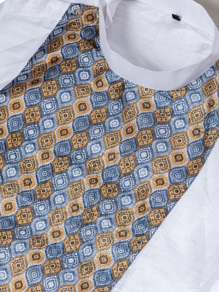 Celebrate tradition with a modern twist in this Angasudha White Dupion Silk Dhoti Kurta Set, crafted for those who appreciate heritage with style. The kurta features a pristine white body enhanced with a bold front panel of geometric printed silk, blending blue and golden hues for a regal touch.