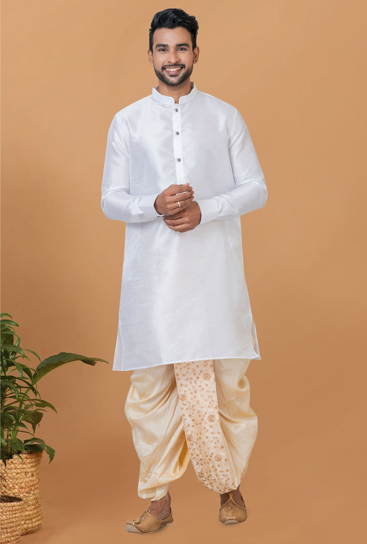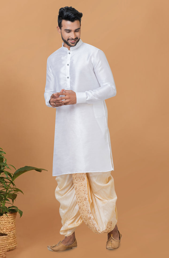 Angasudha White Elegance Kurta with Floral Embroidered Beige Dhoti