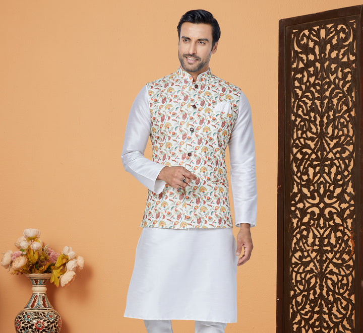 Embrace elegance with a touch of tradition in this Angasudha White Printed Waistcoat Set. The Nehru jacket features a soft cream-white base adorned with classic paisley and floral prints in earthy tones of maroon, mustard, and green—offering a graceful ethnic appeal.