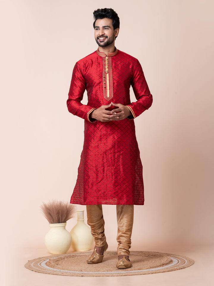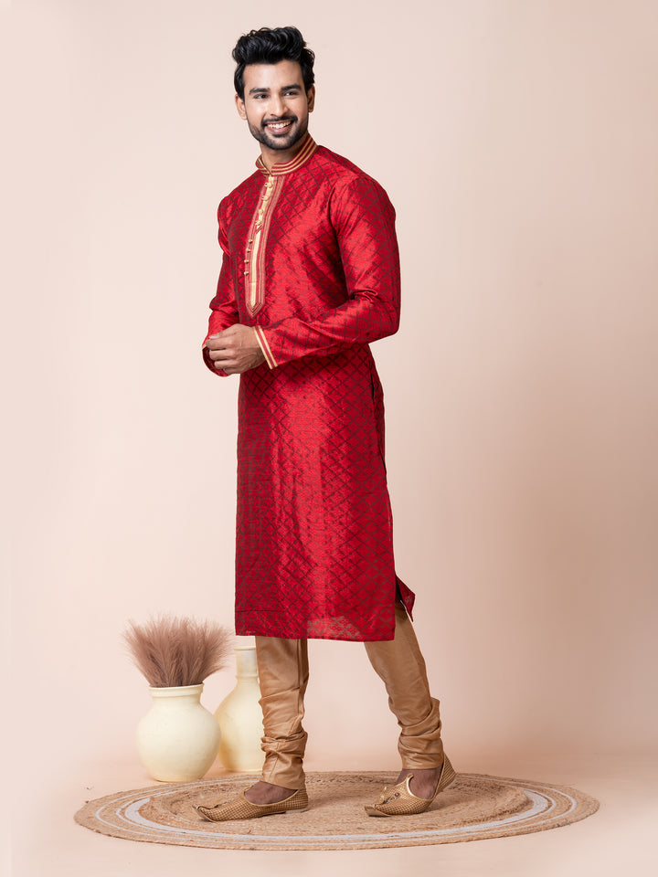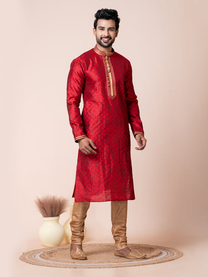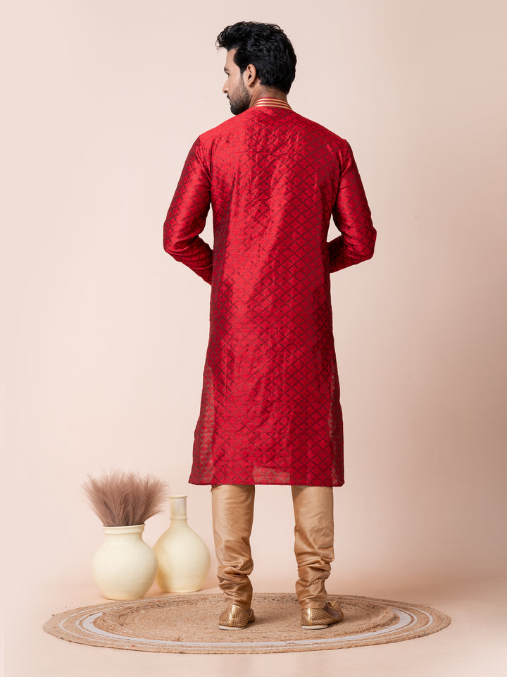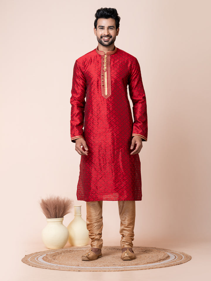 Step into timeless tradition with this stunning red brocade kurta set, designed to make a bold yet classy statement. Crafted with rich silk-blend fabric, the kurta features an intricate diamond-patterned jacquard weave and is adorned with detailed golden embroidery along the placket and neckline. The full sleeves and mandarin collar enhance its royal appeal, while the contrasting beige-golden churidar pajama adds a graceful balance to the ensemble.