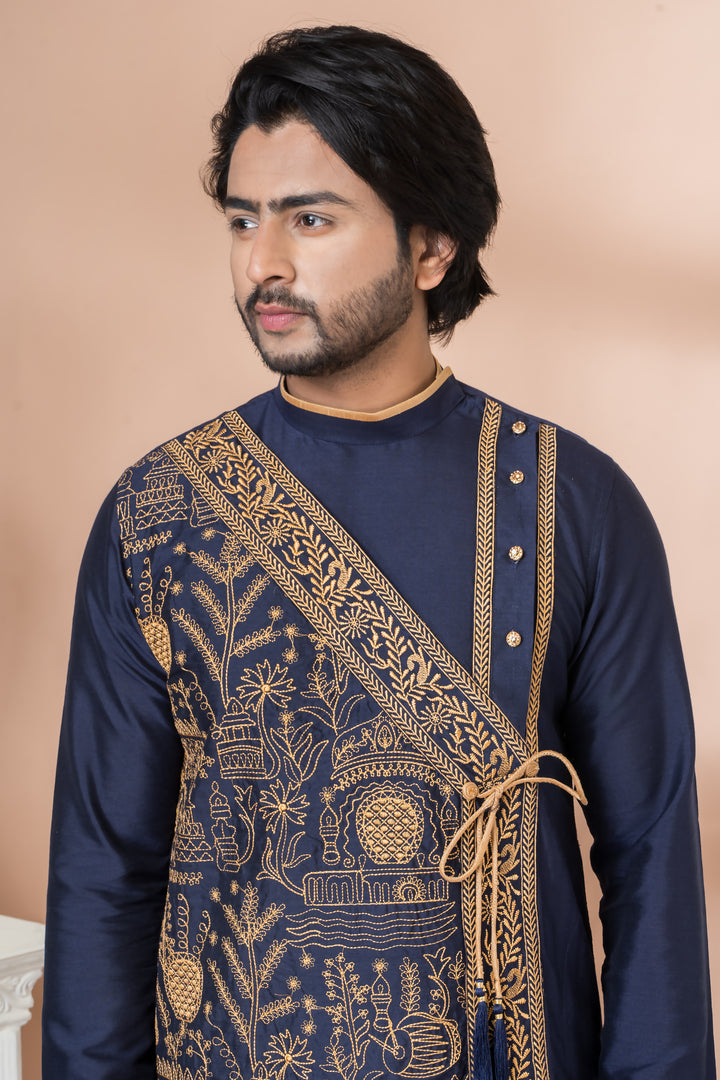 Angasudha Traditional Embroidered Navy Blue Silk Kurta For Men